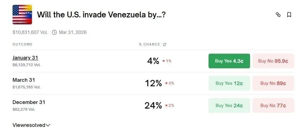 該賭盤由一名匿名交易員于2025年12月18日設(shè)立,題為“美國會否在特定時間前‘入侵’委內(nèi)瑞拉?”,設(shè)有三個時間選項:1月31日、3月31日及12月31日。截至本月9日,賭盤總資金已超過1,156萬美元(,其中880萬美元押注于“Yes(會‘入侵委內(nèi)瑞拉’)”選項。