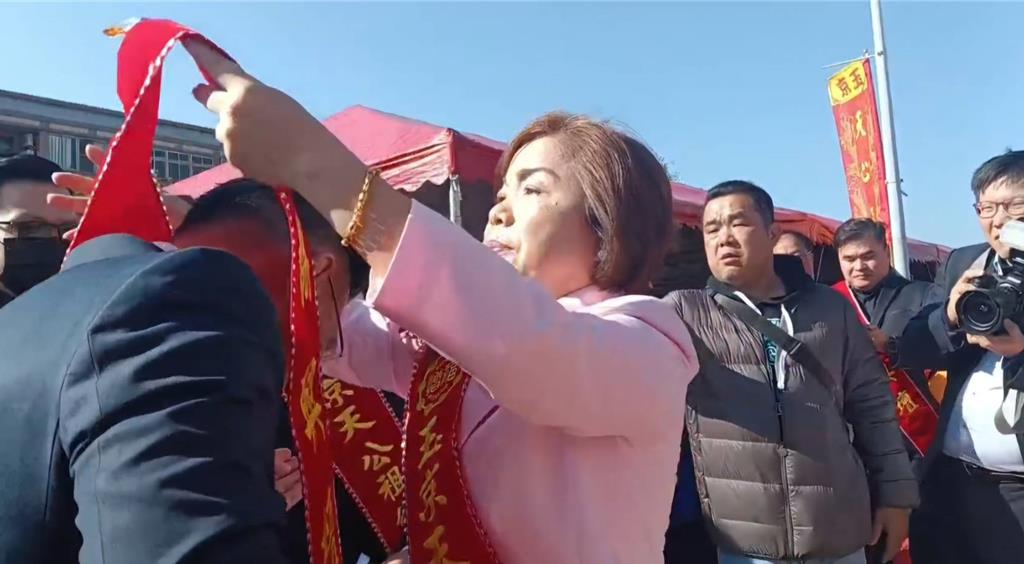▲楊瓊瓔廣邀藍(lán)營(yíng)大咖,黨主席鄭麗文、臺(tái)中市長(zhǎng)盧秀燕、“立法院長(zhǎng)”韓國(guó)瑜等人參加清水區(qū)玉京天公祖總廟龍柱大典。