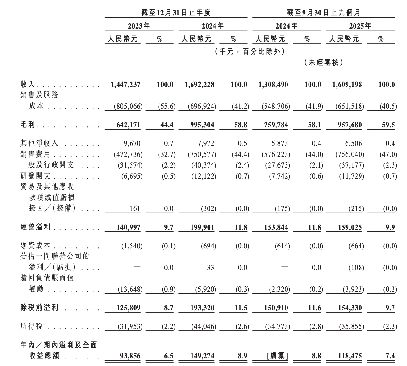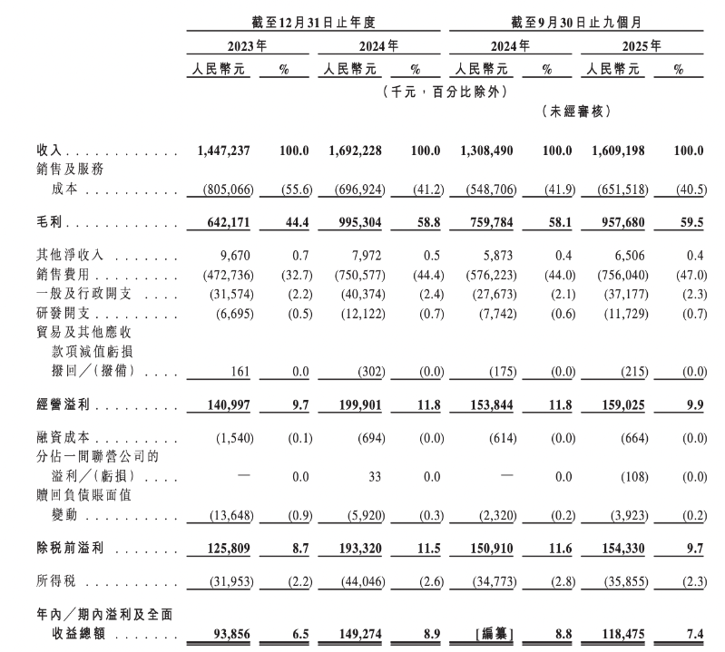 2023年、2024年及2025年前9月,西子健康收入分別為14.47億元、16.92億元、16.09億元,年內(nèi)/期內(nèi)溢利及全面收益總額分別為9385.6萬元、1.49億元、1.18億元,毛利率分別為44.4%、58.8%、59.5%。