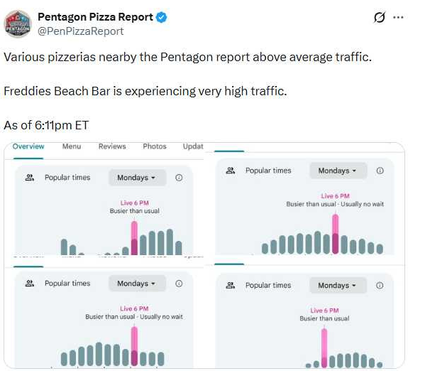 在白宮發(fā)文的敏感時刻,專門追蹤國防部周邊餐飲流量的X賬號“五角大樓薄餅指數(shù)報告”(@PenPizzaReport)也同步發(fā)出報告指出,截至美東時間11日下午4時16分,五角大樓附近的多家薄餅店回報,店內(nèi)顧客量與訂單流量明顯“高于平常水平”。