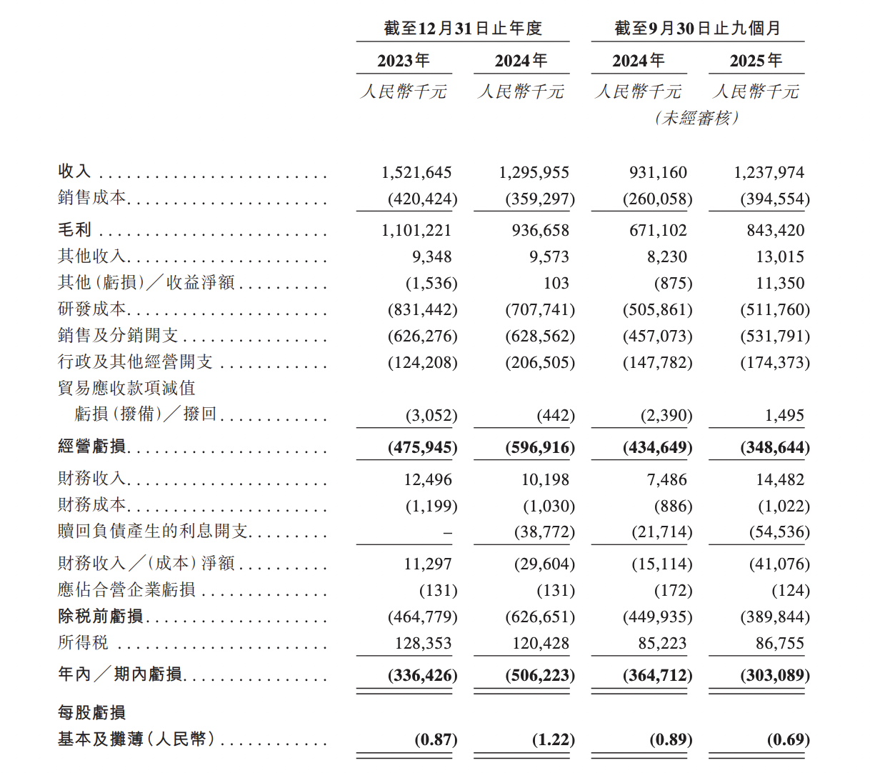 2023年、2024年及2025年前9月,先聲再明收入分別為15.22億元、12.96億元、12.38億元,年內(nèi)╱期內(nèi)虧損分別為3.36億元、5.06億元、3.03億元,毛利率分別為72.4%、72.3%、68.1%。