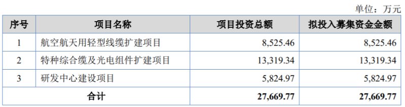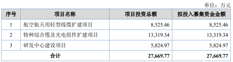 本次IPO,文峰光電擬投入募集資金金額2.77億元,分別用于航空航天用輕型線纜擴(kuò)建項(xiàng)目、特種綜合纜及光電組件擴(kuò)建項(xiàng)目及研發(fā)中心建設(shè)項(xiàng)目。