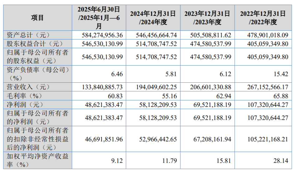 業(yè)績方面,2022年至2024年及2025年上半年(報(bào)告期內(nèi)),文峰光電營業(yè)收入分別為2.67億元、2.07億元、1.94億元、1.34億元,凈利潤分別為1.07億元、6952.12萬元、5812.82萬元、4862.14萬元。