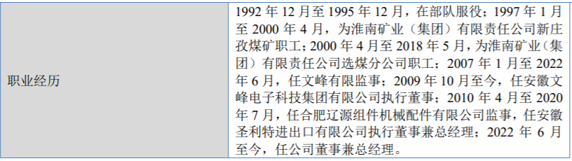 徐文峰,男,出生于1975年1月1日,高中學(xué)歷。他于1992年12月至1995年12月,在部隊(duì)服役;1997年1月至2000年4月,為淮南礦業(yè)(集團(tuán))有限責(zé)任公司新莊孜煤礦職工;2000年4月至2018年5月,為淮南礦業(yè)(集團(tuán))有限責(zé)任公司選煤分公司職工;2007年1月至2022年6月,任文峰有限監(jiān)事;2009年10月至今,任安徽文峰電子科技集團(tuán)有限公司執(zhí)行董事;2010年4月至2020年7月,任合肥遼源組件機(jī)械配件有限公司監(jiān)事,任安徽圣利特進(jìn)出口有限公司執(zhí)行董事兼總經(jīng)理;2022年6月至今,任公司董事兼總經(jīng)理。