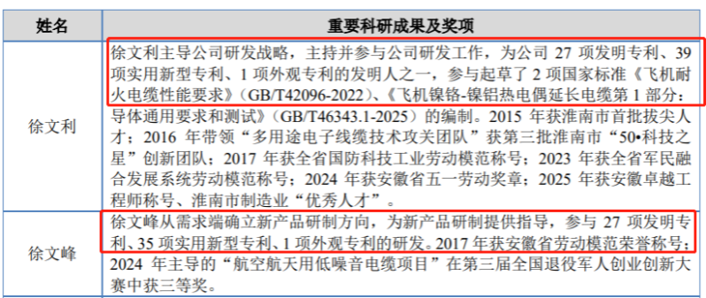 招股書披露,徐文利是公司核心技術(shù)人員之一,主導(dǎo)公司研發(fā)戰(zhàn)略,主持并參與公司研發(fā)工作,為公司27項(xiàng)發(fā)明專利、39項(xiàng)實(shí)用新型專利、1項(xiàng)外觀專利的發(fā)明人之一,參與起草了2項(xiàng)國家標(biāo)準(zhǔn)《飛機(jī)耐火電纜性能要求》(GB/T42096-2022)、《飛機(jī)鎳鉻-鎳鋁熱電偶延長電纜第1部分:導(dǎo)體通用要求和測(cè)試》(GB/T46343.1-2025)的編制。