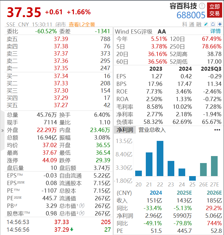 股價(jià)方面,1月13日,容百科技股價(jià)逆勢(shì)走強(qiáng),截至收盤,漲幅為1.66%,報(bào)37.35元,總市值為267億元。