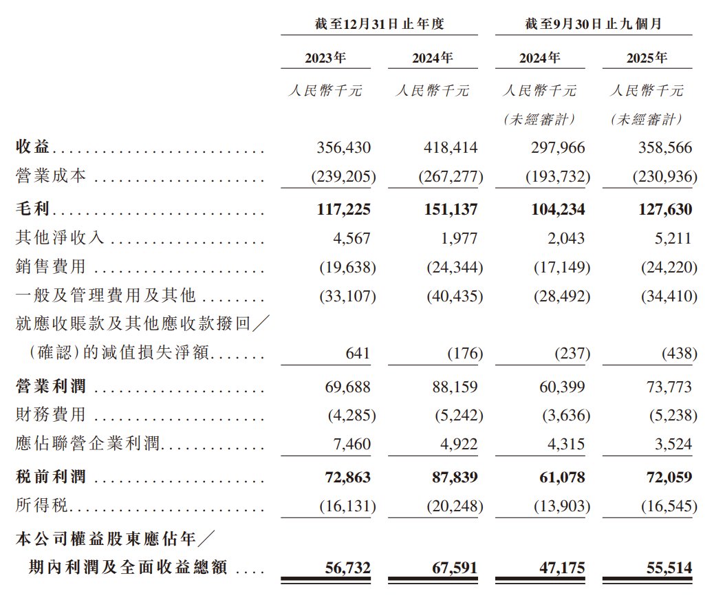 公司于2023年度、2024年度、2025年截至9月30日止九個(gè)月分別錄得溢利為5673.2萬元、6759.1萬元、5551.4萬元人民幣。