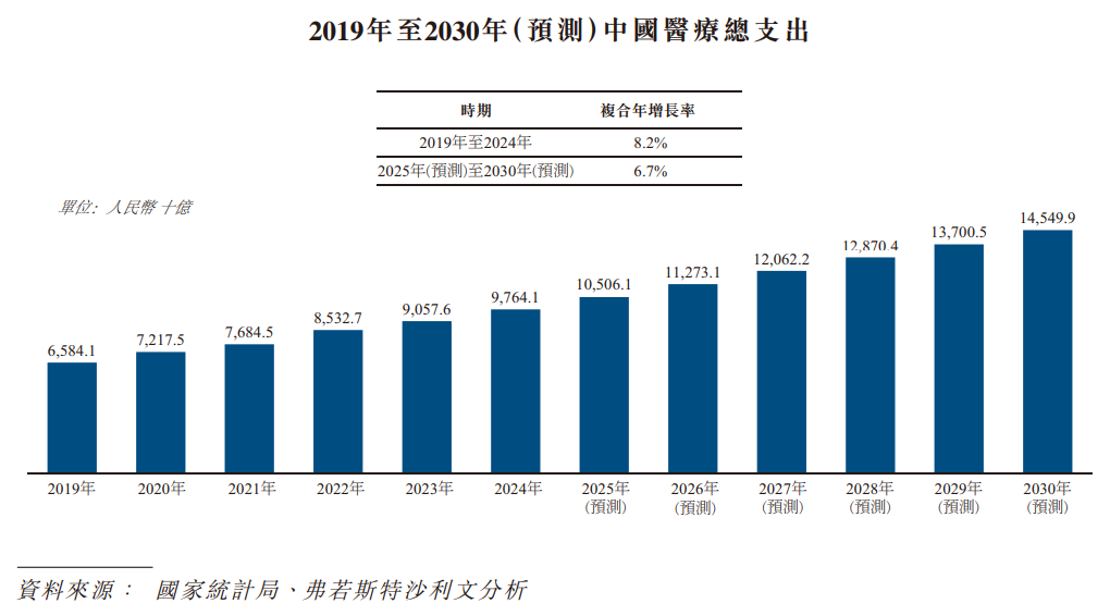 在健康意識(shí)日益提升、公共醫(yī)療保險(xiǎn)覆蓋面擴(kuò)大以及商業(yè)保險(xiǎn)的發(fā)展加上慢性疾病高發(fā)的推動(dòng)下,近年來,中國(guó)醫(yī)療服務(wù)市場(chǎng)穩(wěn)中向好。醫(yī)療總支出由2019年的人民幣6.58萬億元增至2024年的人民幣9.76萬億元,2019年至2024年的復(fù)合年增長(zhǎng)率為8.2%。此外,預(yù)計(jì)到2030年,醫(yī)療總支出將達(dá)到人民幣14.55萬億元,2025年至2030年的復(fù)合年增長(zhǎng)率為6.7%。