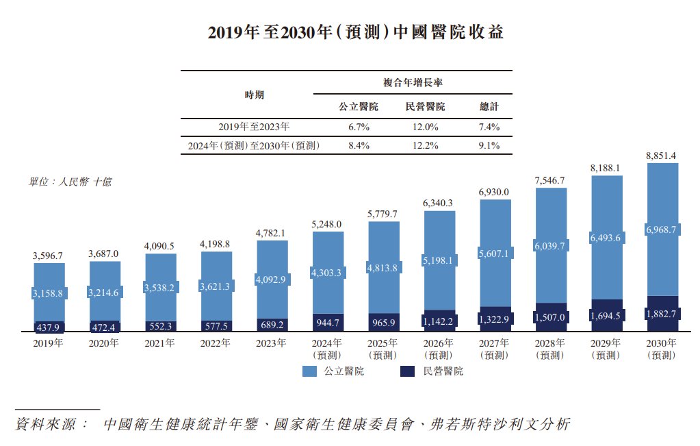 民營(yíng)醫(yī)院的收益由2019年的人民幣4379億元增長(zhǎng)至2023年的人民幣6892億元,2019年至2023年的復(fù)合年增長(zhǎng)率為12.0%,2019年至2023年的復(fù)合年增長(zhǎng)率為12.0%,并預(yù)計(jì)將于2030年達(dá)到人民幣1.88萬億元,2024年至2030年的復(fù)合年增長(zhǎng)率為12.2%。同期,公立醫(yī)院于2019年至2023年的復(fù)合年增長(zhǎng)率為6.7%,預(yù)計(jì)于2024年至2030年的復(fù)合年增長(zhǎng)率將為8.4%。
