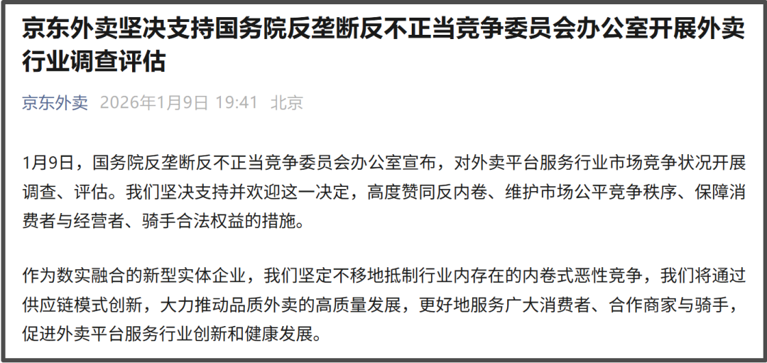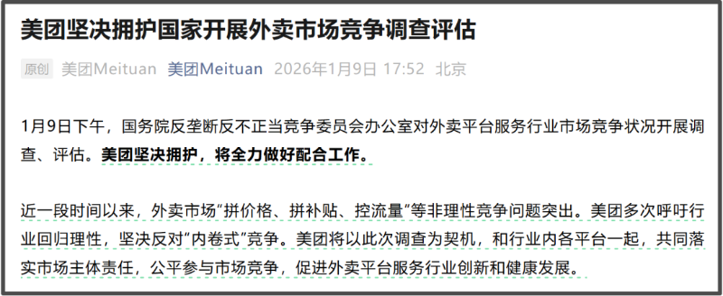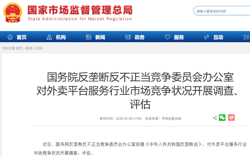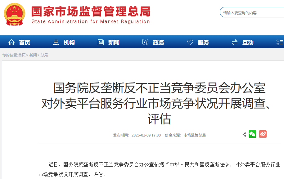 1月9日,一個(gè)平日極少露面的監(jiān)管機(jī)構(gòu)出手了——國(guó)務(wù)院反壟斷反不正當(dāng)競(jìng)爭(zhēng)委員會(huì)辦公室(簡(jiǎn)稱(chēng)“雙反辦”)對(duì)外賣(mài)平臺(tái)服務(wù)行業(yè)啟動(dòng)調(diào)查。