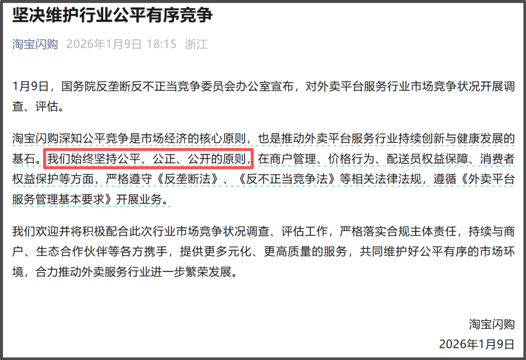 只是,相比美團(tuán)、京東高調(diào)表態(tài)"堅(jiān)決支持"堅(jiān)決擁護(hù)",淘寶閃購(gòu)的回應(yīng)則強(qiáng)調(diào)"公平、公正、公開(kāi)"。對(duì)此坊間有一種解讀是,淘寶閃購(gòu)話(huà)沒(méi)說(shuō)破,但意思很明顯:在合規(guī)框架下,老大位置,我還是要爭(zhēng)。