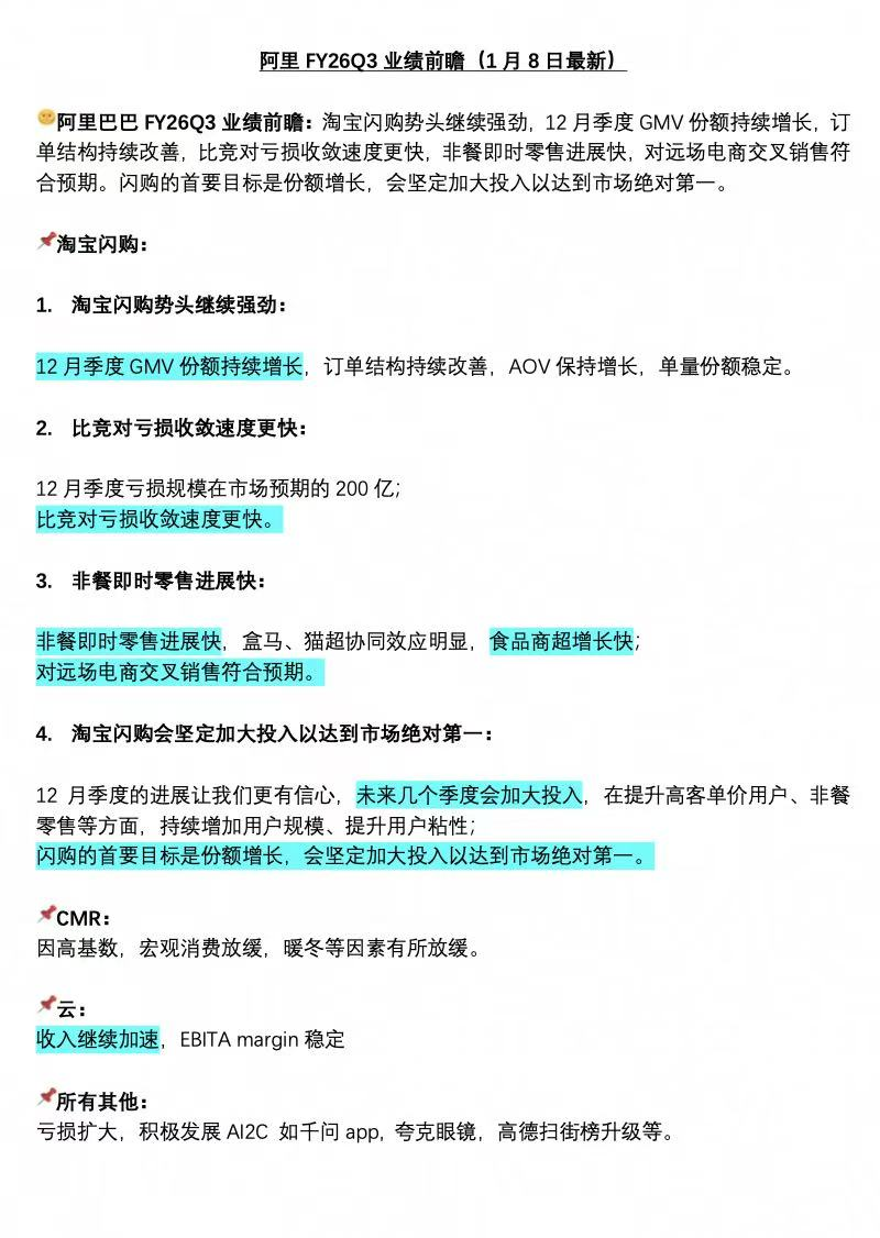 1月8日,阿里面向投資者的交流信息流傳開(kāi)來(lái),最引人注目的是淘寶閃購(gòu)業(yè)務(wù)。截圖信息顯示,2026年,淘寶閃購(gòu)首要目標(biāo)是份額增長(zhǎng),會(huì)堅(jiān)定加大投入以達(dá)到市場(chǎng)絕對(duì)第一。