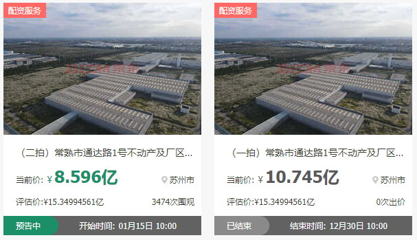 如今時隔半個月,江蘇省常熟市人民法院迅速啟動二拍程序,起拍價進一步下探。經(jīng)計算,8.596億元的二拍起拍價,較15.35億元的評估價折讓幅度擴大至約44%。