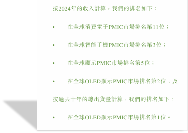 憑借SMI的積累,芯邁在高端顯示應(yīng)用中的定制化電源管理IC領(lǐng)域擁有領(lǐng)先地位。據(jù)弗若斯特沙利文數(shù)據(jù),按2024年收入計,芯邁在全球智能手機PMIC市場排名第三,全球顯示PMIC市場排名第五,全球OLED顯示PMIC市場排名第二。