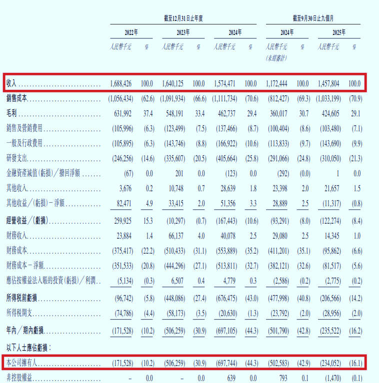 芯邁目前仍未能擺脫虧損困境。2022年至2024年,歸母凈虧損分別為1.72億元、5.06億元、6.97億元,2025年前九個月虧損收窄至2.36億元。招股書還稱,2025年全年仍預(yù)計出現(xiàn)重大虧損,盈利改善仍需時日。