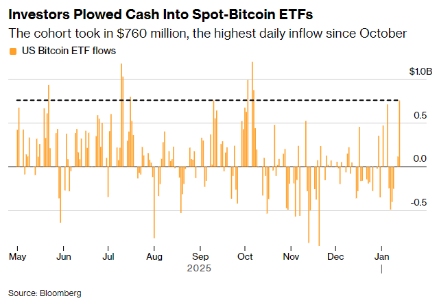 加密貨幣投資者正以一貫的姿態(tài)開啟新年:大舉涌入比特幣ETF。統(tǒng)計(jì)數(shù)據(jù)顯示,本周二,持有比特幣的十余只ETF共錄得約7.6億美元資金流入,創(chuàng)去年10月以來最大單日凈流入。其中,比特幣ETF-Fidelity(FBTC.US)貢獻(xiàn)了主要部分,單日吸金3.51億美元。