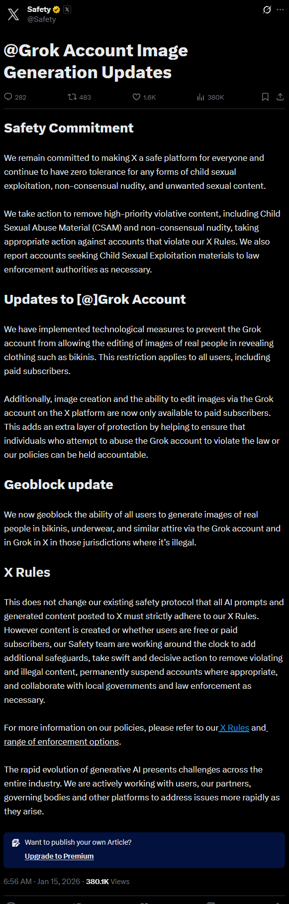 X平臺(tái)安全團(tuán)隊(duì)表示,已實(shí)施技術(shù)措施,防止Grok賬號(hào)允許編輯真人穿著比基尼等暴露服裝的圖像,此項(xiàng)限制適用于所有用戶,包括付費(fèi)訂閱用戶。
