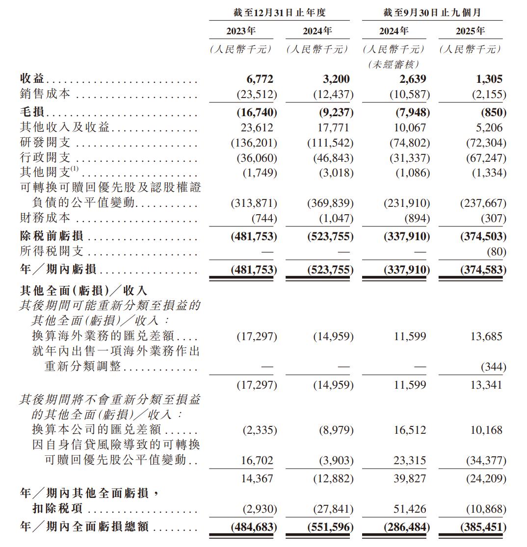 公司于2023年度、2024年度、2025年截至9月30日止九個月分別錄得虧損約為4.82億元、5.24億元、3.75億元人民幣,主要來自與研發(fā)活動及行政活動有關的開支。