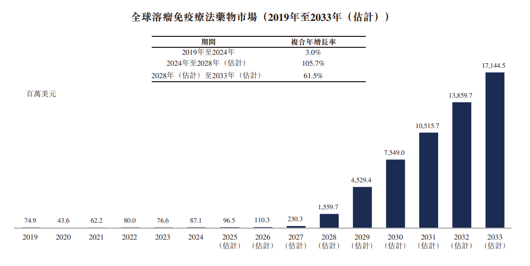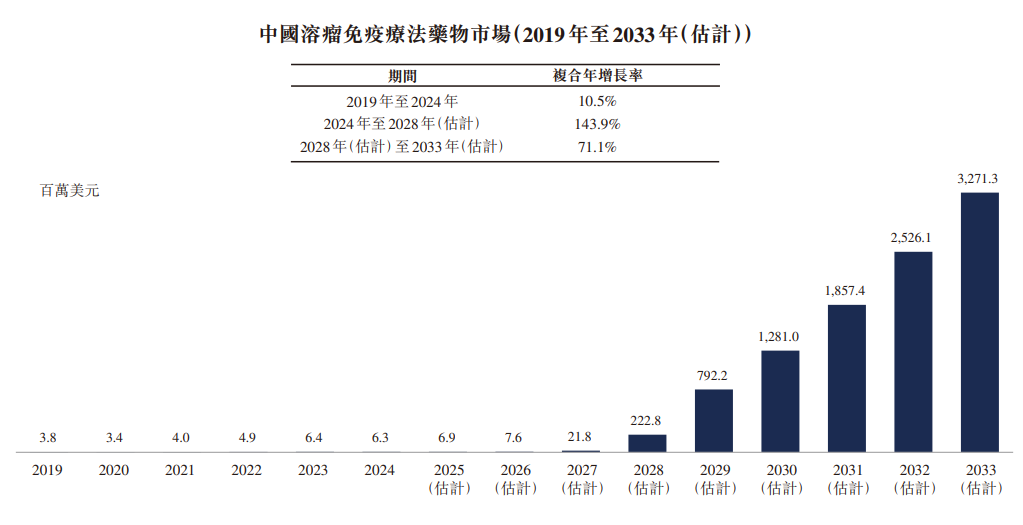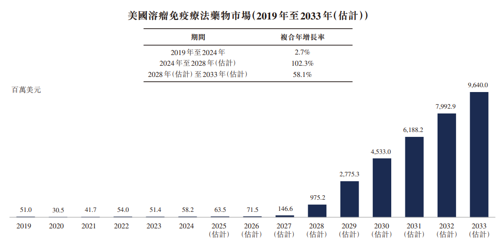 中國在溶瘤免疫療法領域的發(fā)展勢頭亦堪稱迅猛。根據弗若斯特沙利文的資料,2025年至2033年間中國預期至少將有六款新型溶瘤免疫療法獲批上市,其適應癥范圍同樣亦會擴展至覆蓋更多實體瘤類型。此等動態(tài)共同預示中國溶瘤病毒藥物市場將迎來顯著增長,預計該市場規(guī)模將由2024年的630萬美元增長至2028年的2.23億美元,并于2033年進一步攀升至32.71億美元,2024年至2028年間復合年增長率高達143.9%,2028年至2033年間則為71.1%。