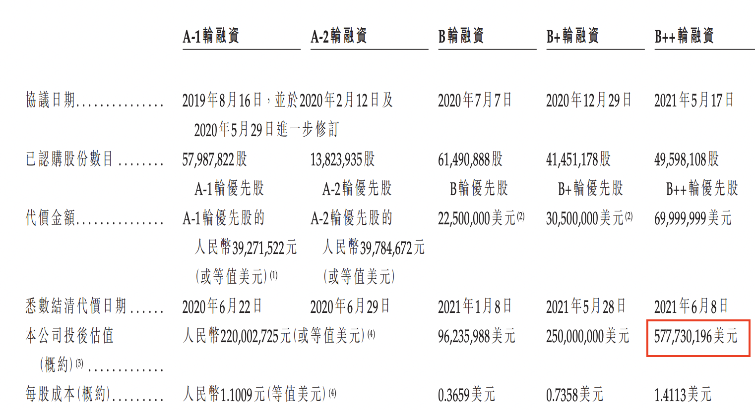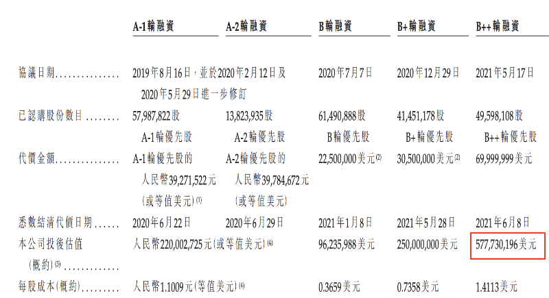 成立以來,嘉因生物進(jìn)行了A-1輪、A-2輪、B輪、B+輪及B++輪融資(包括可換股貸款),并從投資者獲得總投資額9.4億元的投資。2021年6月完成B++輪融資,其投后估值為5.78億美元。