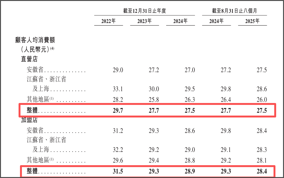 此外,在“極致性價比”成為消費主流的當下,老鄉(xiāng)雞也面臨著“漲價丟客、降價虧利”的兩難境地。招股書顯示,為了吸引消費者,該公司不斷降低客單價,直營店顧客人均消費金額從2022年的29.7元下降至2025年前八個月的27.5元,加盟店顧客人均消費金額則從31.5元降至28.4元。
