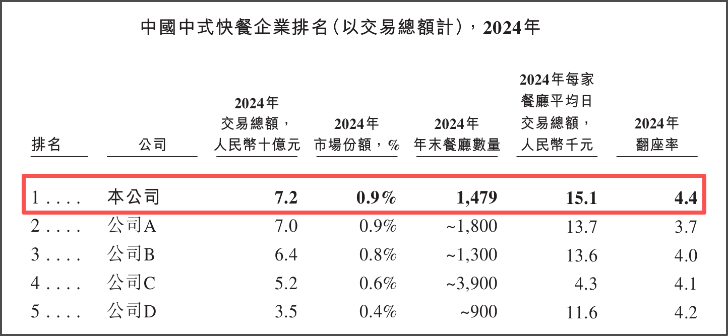 作為行業(yè)“頭部玩家”,老鄉(xiāng)雞業(yè)績基本面不乏亮點。2022至2024年,公司營收從45.28億元增至62.88億元,歸母凈利潤從2.52億元增至4.09億元。按2024年交易總額計算,老鄉(xiāng)雞以0.9%的市場占有率位居中式快餐行業(yè)第一。
