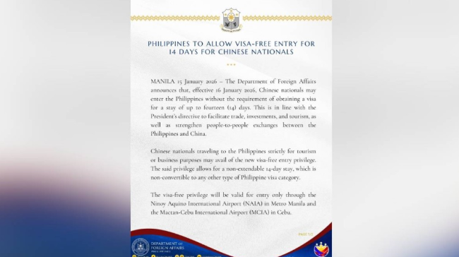 菲律賓外交部指,自2026年1月16日起,中國公民可免簽入境菲律賓,停留時間最長為14天。政策僅適用于經(jīng)馬尼拉和宿務(wù)機場入境的游客,且14天的停留期限不可延長。
