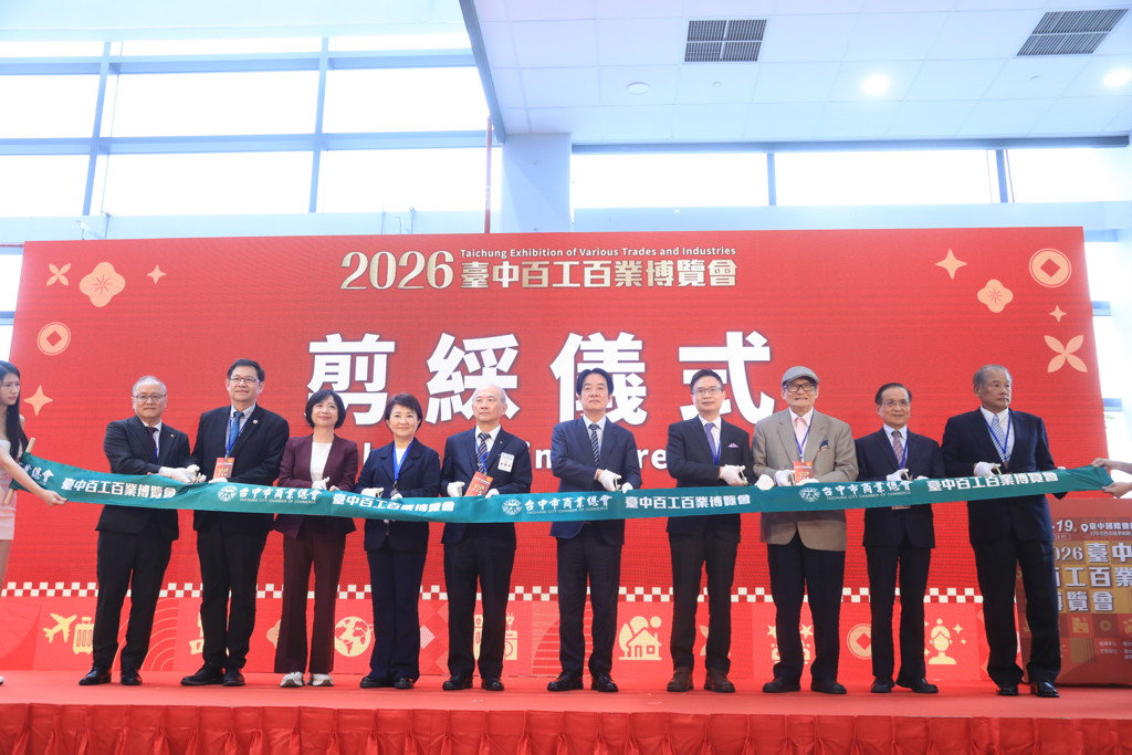 ▲臺中百工百業(yè)博覽會16日于國際會展中心盛大開幕,賴清德(右五)、市長盧秀燕(左四)出席剪彩儀式。