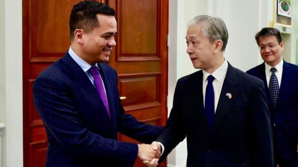 ▲中國(guó)駐柬大使汪文斌會(huì)見柬埔寨副首相兼內(nèi)政大臣韶索卡?!都碇袝r(shí)報(bào)》