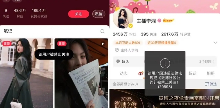 ▲知名主持人李湘多個社交賬號于早前突遭全線禁言,微博、抖音、小紅書三大平臺同步限制關(guān)注功能,令這位擁有2,900萬粉絲的明星瞬間引發(fā)網(wǎng)民熱議。