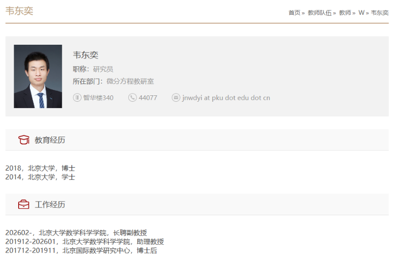 據(jù)光明日?qǐng)?bào)報(bào)道,根據(jù)北京大學(xué)數(shù)學(xué)科學(xué)學(xué)院網(wǎng)站信息,從2026年2月起,該院教師韋東奕正式獲聘北京大學(xué)長(zhǎng)聘副教授。