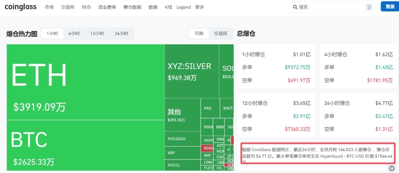 據(jù)coinglass顯示,最近24小時(shí),全球共有166470人被爆倉。