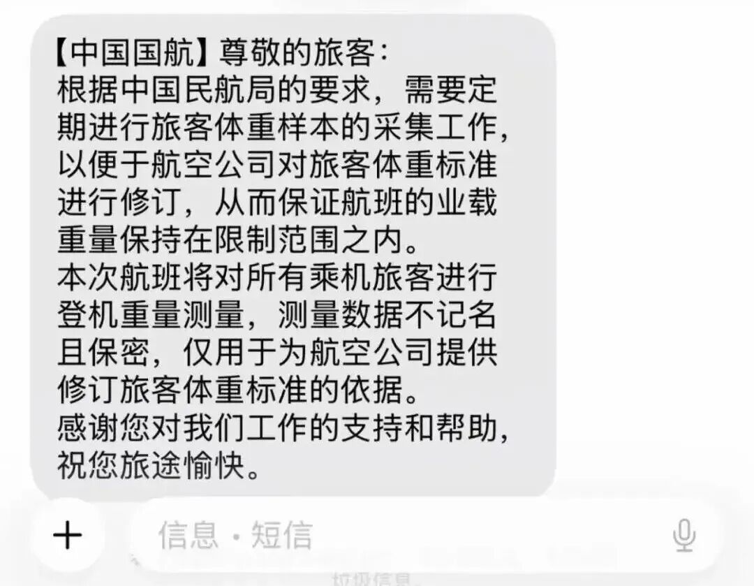 網(wǎng)友提供的航司短信稱,據(jù)中國民航局要求,需定期進行旅客體重樣本的采集工作,以便于航司對旅客體重標(biāo)準(zhǔn)進行修訂,“本次航班將對所有乘機旅客進行登機重量測量,測量數(shù)據(jù)不記名且保密,僅用于為航空公司提供修訂旅客體重標(biāo)準(zhǔn)的依據(jù)?!?/span>