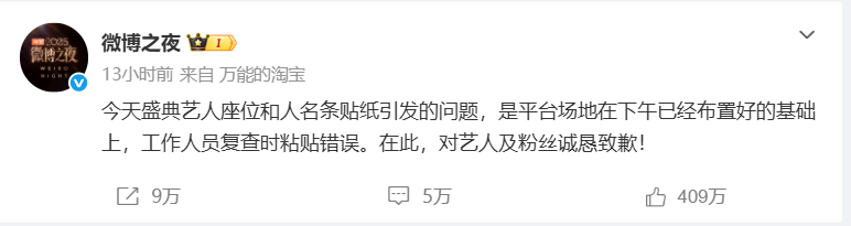 首先,就2月5日微博之夜活動(dòng)中因座位人名條粘貼失誤所引發(fā)的爭(zhēng)議,我們向所有受到影響的藝人和粉絲朋友,以及所有關(guān)注本次活動(dòng)的觀眾朋友,鄭重致歉。