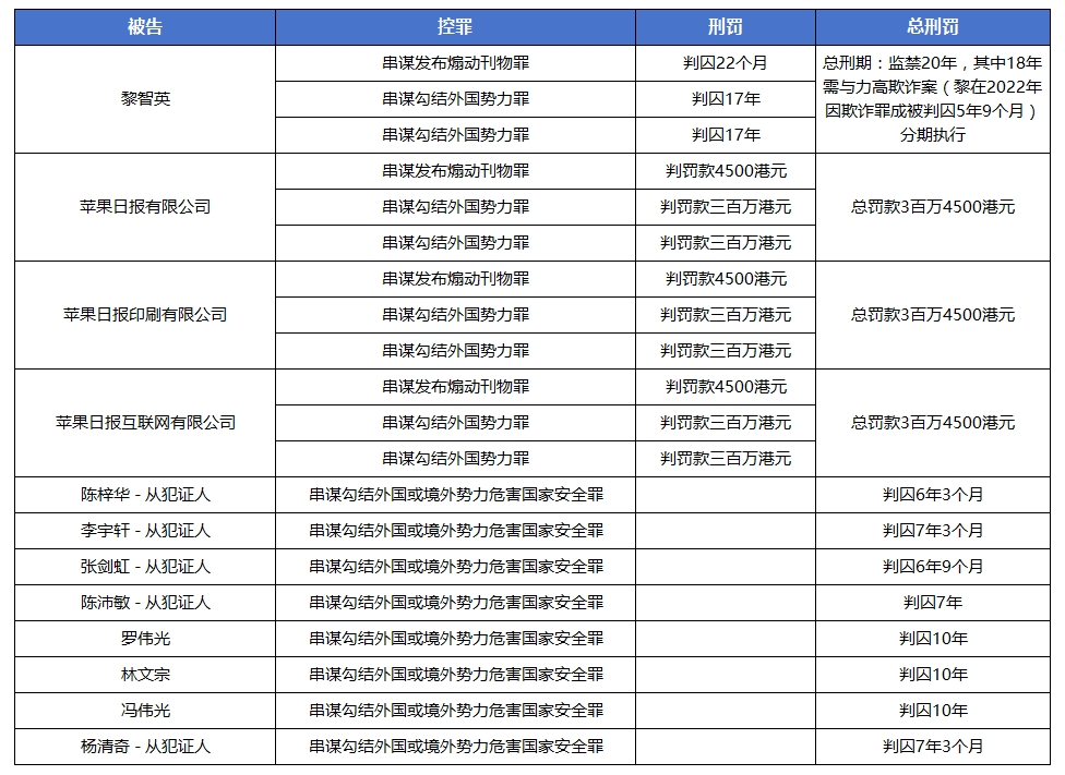 壹傳媒創(chuàng)辦人黎智英與《蘋果日報(bào)》三間相關(guān)公司去年被裁定“串謀勾結(jié)外國勢力”及“串謀發(fā)布煽動(dòng)刊物”3罪罪成,黎智英今早于西九龍法院被判囚20 年;從犯證人陳梓華判囚6月3個(gè)月、李宇軒監(jiān)禁7年3個(gè)月、張劍虹、陳沛敏分別判囚6年9個(gè)月與7年、楊清奇入獄7年3個(gè)月;另羅偉光、林文宗及馮偉光各判囚10年。而三間相關(guān)公司各罰款300萬4500港元。