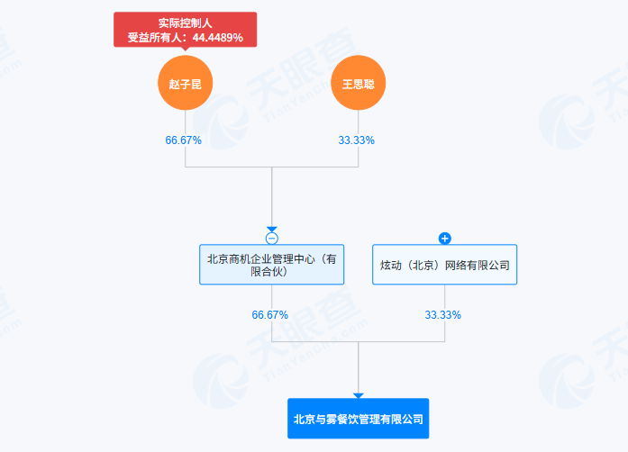 穿透股權(quán)來看,王思聰持股33.33%的北京商機(jī)企業(yè)管理中心(有限合伙)是與霧餐飲公司的大股東,持股比例為66.67%。