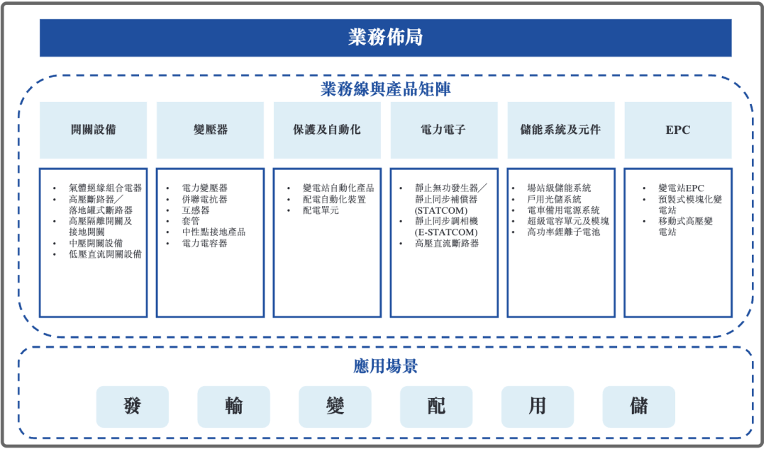 公司構建了覆蓋開關類、變壓器類、保護及自動化類、電力電子類、儲能系統(tǒng)及元件類、EPC類等六大核心業(yè)務線的產業(yè)鏈布局,形成了“產品+解決方案+服務”的業(yè)務生態(tài)和豐富的產品矩陣,廣泛應用于電網(wǎng)、新能源(光伏、風電)、冶金、石化、交通、數(shù)據(jù)中心等多元行業(yè)應用場景。