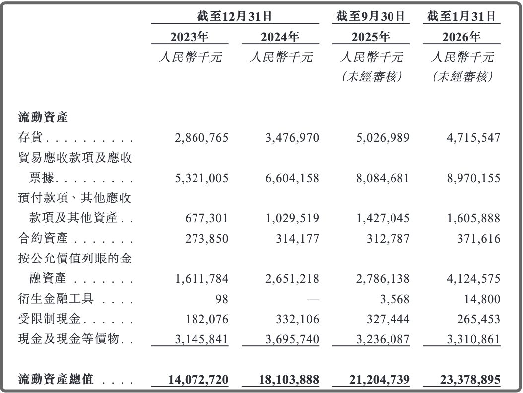 在公司的招股書中,不斷延長的貿易應收款周轉天數(shù)引人關注,2023年-2025年前三季度分別達到了126天、129天和138天。與此同時,不斷擴大的貿易應收款項及應收票據(jù)也格外刺眼,從2023年的53.21億元增長到了2025年前三季度的80.85億元,到了今年1月底又進一步擴大至89.7億元。