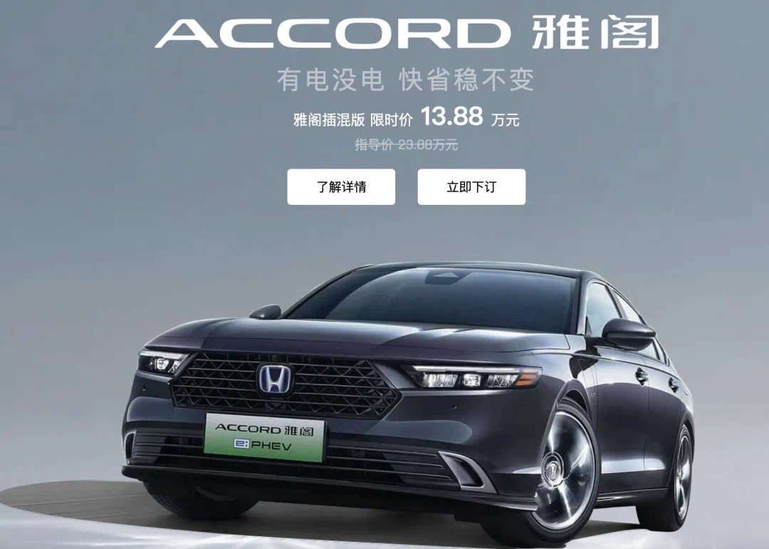 廣汽本田近日宣布,為慶祝雅閣50周年,老客戶復(fù)購雅閣e:PHEV車型,僅需13.88萬元,較官方指導(dǎo)價(jià)直降10萬元,創(chuàng)下上市后最高降價(jià)紀(jì)錄,限量1000輛。