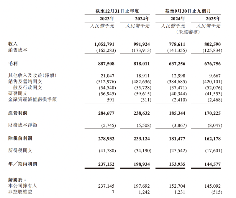 2023年、2024年及2025年前9月,漢方制藥收入分別為10.53億元、9.92億元及8.03億元;年/期內(nèi)利潤分別為2.37億元、1.99億元及1.45億元;毛利率分別為84.3%、 82.5%及 84.3%。
