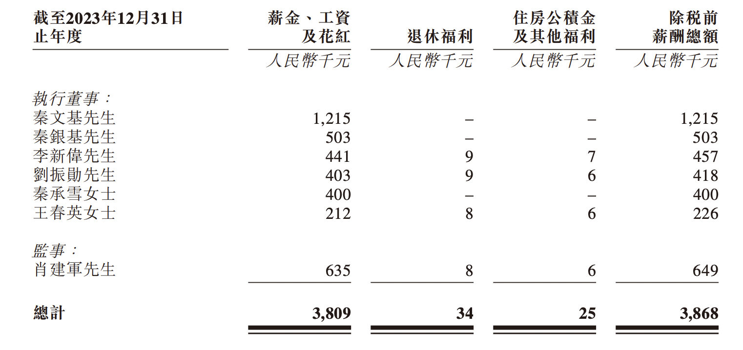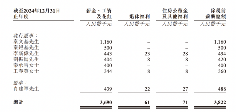 薪酬方面,2023年、2024年,秦文基除稅前薪酬總額分別為121.5萬元、116萬元,秦銀基薪酬分別為50.3萬元、50萬元。