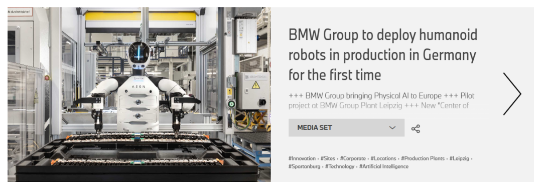 周五(2月27日),寶馬集團(tuán)在官網(wǎng)宣布,公司首次將物理人工智能引入歐洲——在萊比錫工廠啟動(dòng)了人形機(jī)器人試點(diǎn)項(xiàng)目。