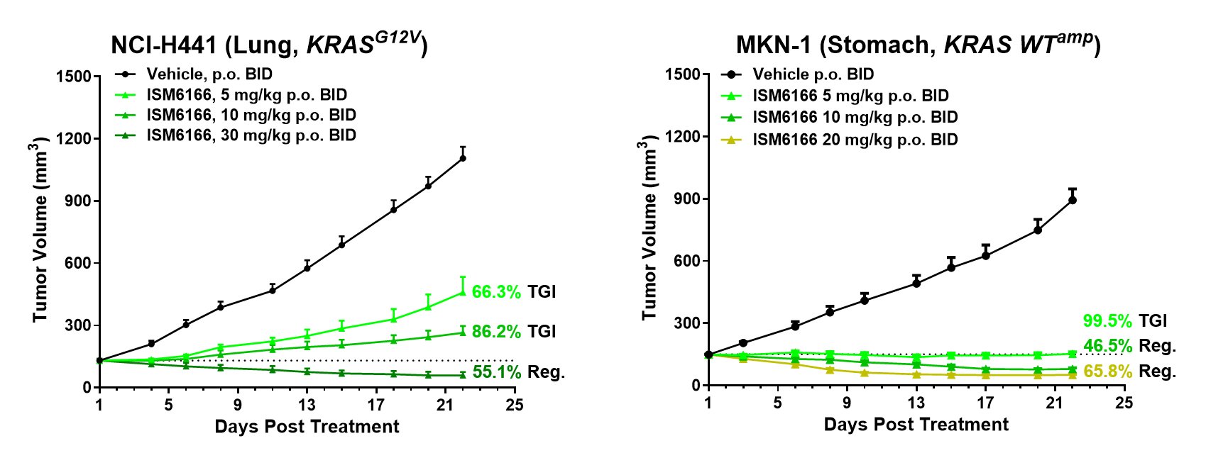 在肺癌模型中,ISM6166在10 mg/kg劑量下實現(xiàn)86.2%的腫瘤生長抑制率(TGI),并在30 mg/kg劑量下實現(xiàn)55.1%的腫瘤消退。胃癌模型中的抗腫瘤藥效更為顯著,ISM6166在5 mg/kg劑量下的TGI達到99.5%,更高劑量則誘導高達65.8%的腫瘤消退。上述數(shù)據(jù)表明,ISM6166不僅能夠抑制腫瘤生長,還能在多種KRAS變異的腫瘤模型中有效縮小腫瘤。