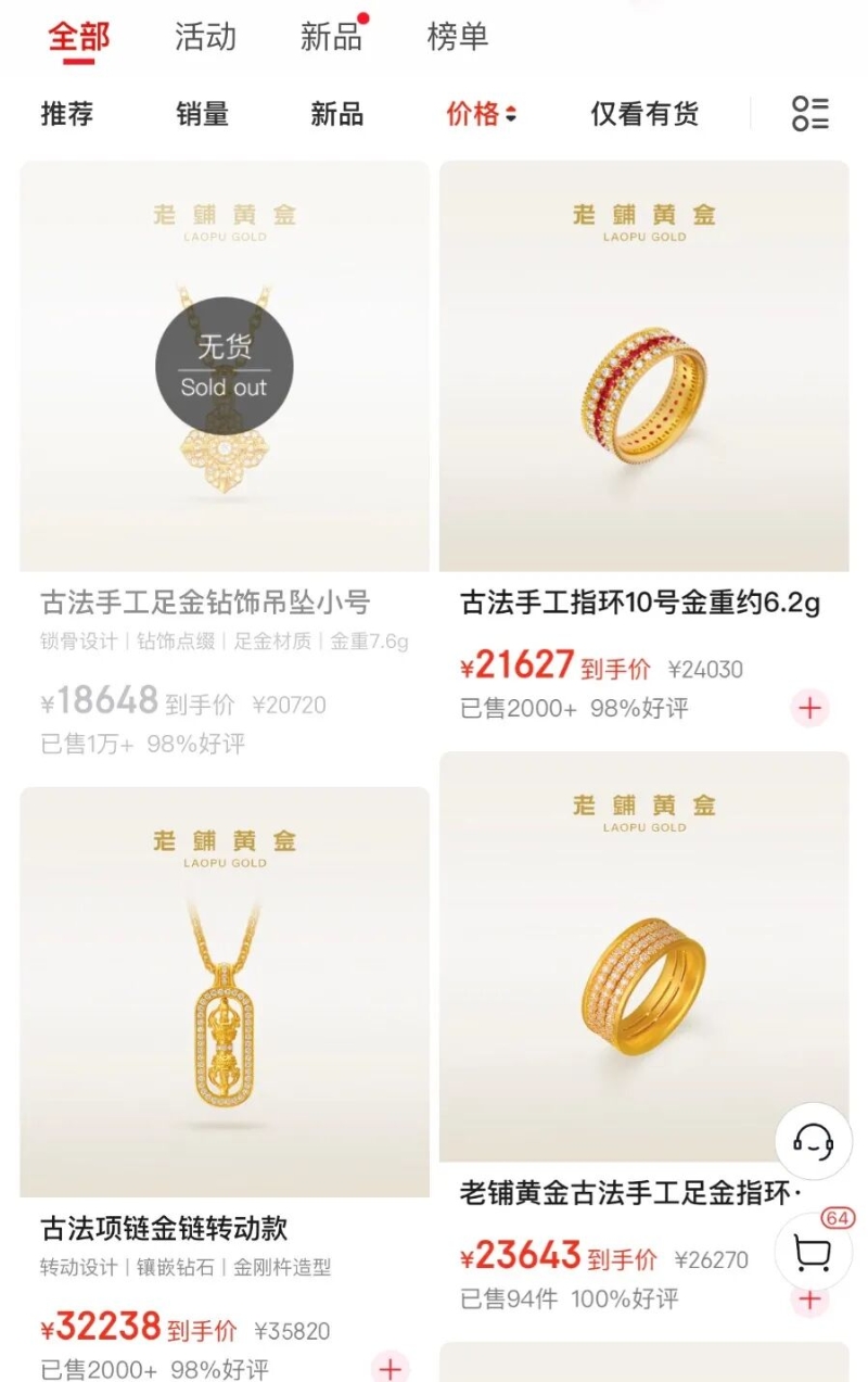 在漲價之后,依據(jù)老鋪黃金官網(wǎng)價格,價格最低的是一款7.6克的古法手工足金鉆飾吊墜(小號),價格為18648元(顯示已售罄);價格最高的則是91845元的足金吊墜金鏈款佛祖吊墜,克重約37.8克。計算下來,每克單價(含工藝費)逼近2500元。