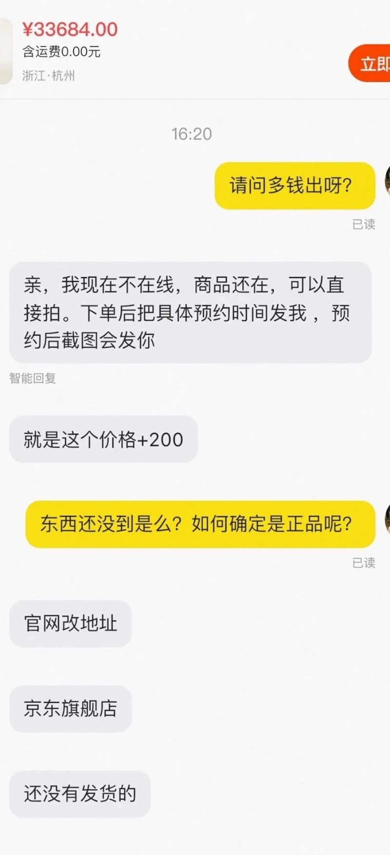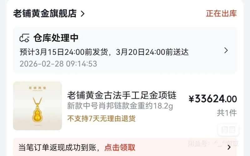 在一張網(wǎng)友發(fā)布的轉(zhuǎn)賣老鋪黃金截圖中可以看到,賣家以33624元購入一條18.2克的項鏈,顯示3月15日前發(fā)貨。在溝通中,賣家表示該產(chǎn)品加價200元可以出。