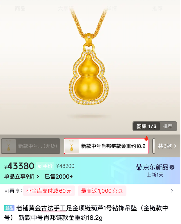 而目前,同等克重的葫蘆吊墜已漲至43380元,差價近萬元,產(chǎn)品上漲幅度達29%。
