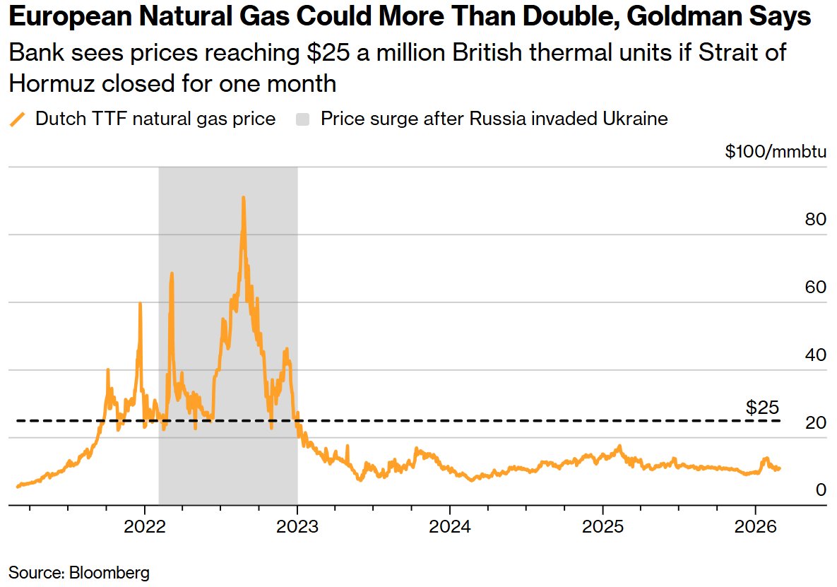 根據(jù)高盛集團(tuán)的分析,如果通過霍爾木茲海峽的航運停滯一個月,歐洲天然氣價格可能會翻一倍以上。