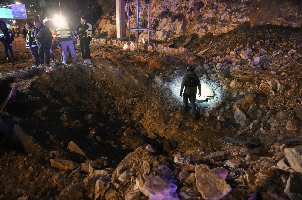 以色列第12頻道電視臺周日(1日)晚播出的畫面顯示,數(shù)個發(fā)光物體從空中落下,耶路撒冷其中一棟建筑被擊中,街道上碎片散落,并出現(xiàn)一個直徑約10米的深坑,有車輛被損毀。