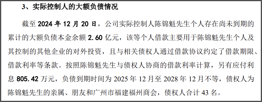 截至2024年12月20日,陳錦魁仍有負(fù)債本金2.60億元,應(yīng)付利息805.42萬元,合計(jì)逾2.68億元,債權(quán)人為其親屬、朋友及廣州市福建福州商會(huì)共計(jì)43名,債務(wù)到期時(shí)間分布在2025年12月至2028年12月。