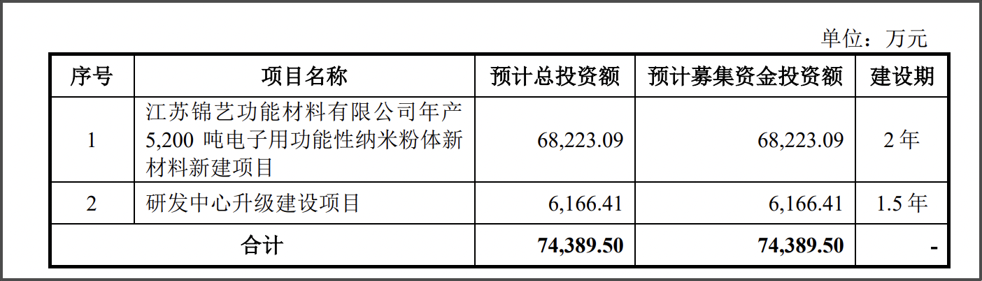 招股書顯示,錦藝新材募集資金投資項(xiàng)目擬投入7.44億元,其中6.82億元用于江蘇錦藝功能材料有限公司年產(chǎn)5200噸電子用功能性納米粉體新材料建設(shè)項(xiàng)目,6166.41萬元用于研發(fā)中心升級(jí)建設(shè)項(xiàng)目。